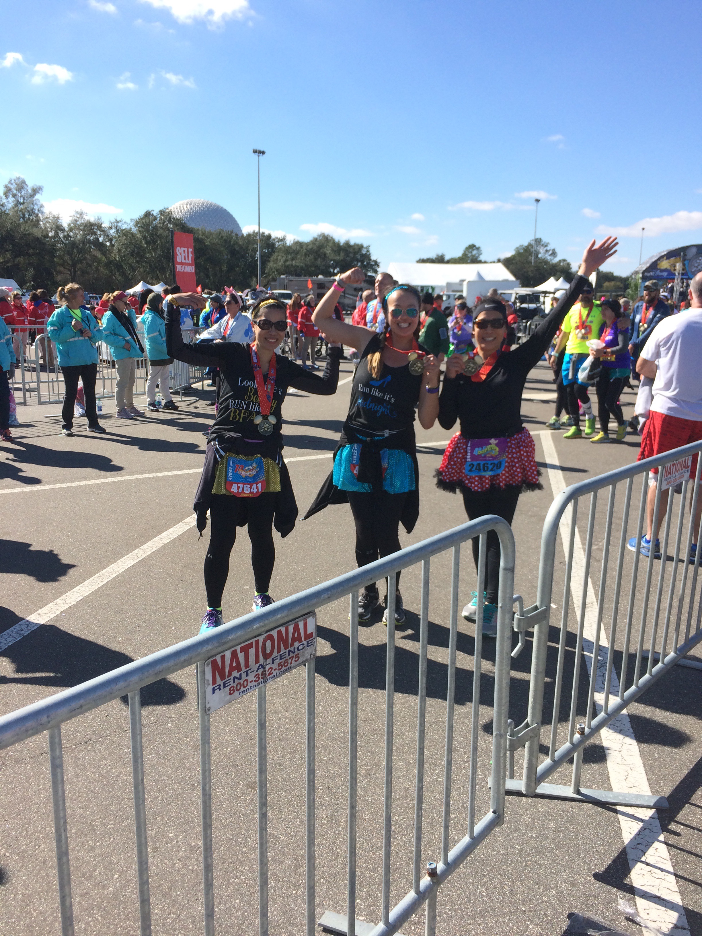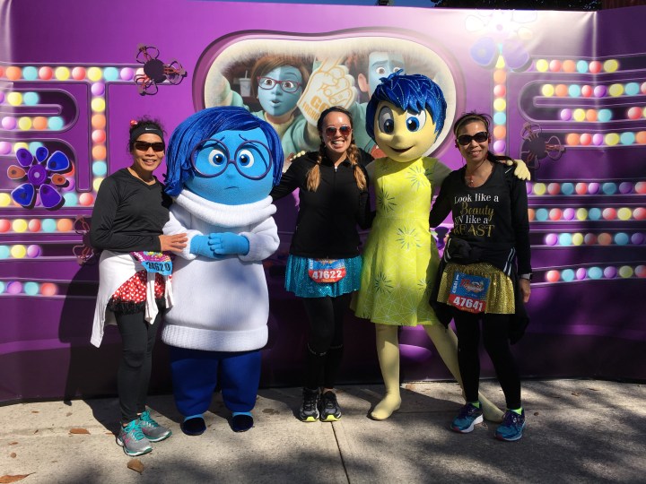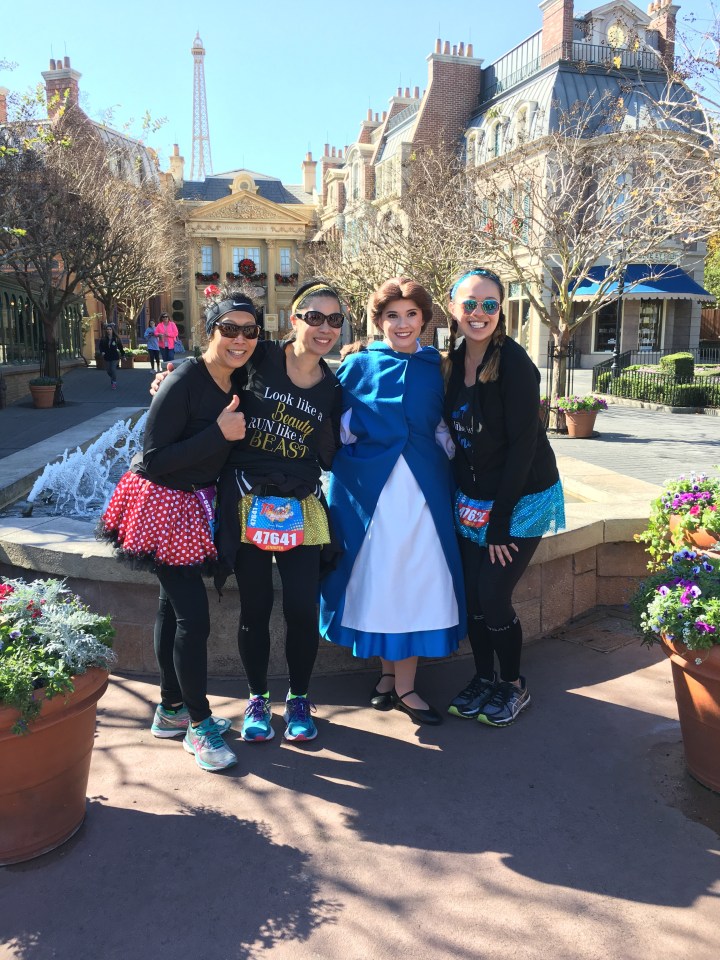 So we’re jogging along just fine and BAM mile 16 I hit a wall where I was like “okay I need to wave the white flag…muscles I didn’t even know existed on my leg have sharp pain”. My aunt and cousin said let’s walk .2 of a mile and jog the rest of the mile. The little reprieve helped me get it together and we were sailing again from mile 18-21 and then mile 21 starts and BAM my legs are jello and I’m pretty sure I’m going to die since I felt like crumpling up into the fetal position where I would most likely be trampled. Of course I am a germaphobe and can’t lay on the ground everyone walks/runs on so I continue to soldier on as a power walker. Thank God for my aunt and cousin because if it weren’t for the mutual misery or the pep talks, I’m pretty sure I’d still be on the track 😛 we end up walking and stopping for pictures with Disney characters to forget the pain.