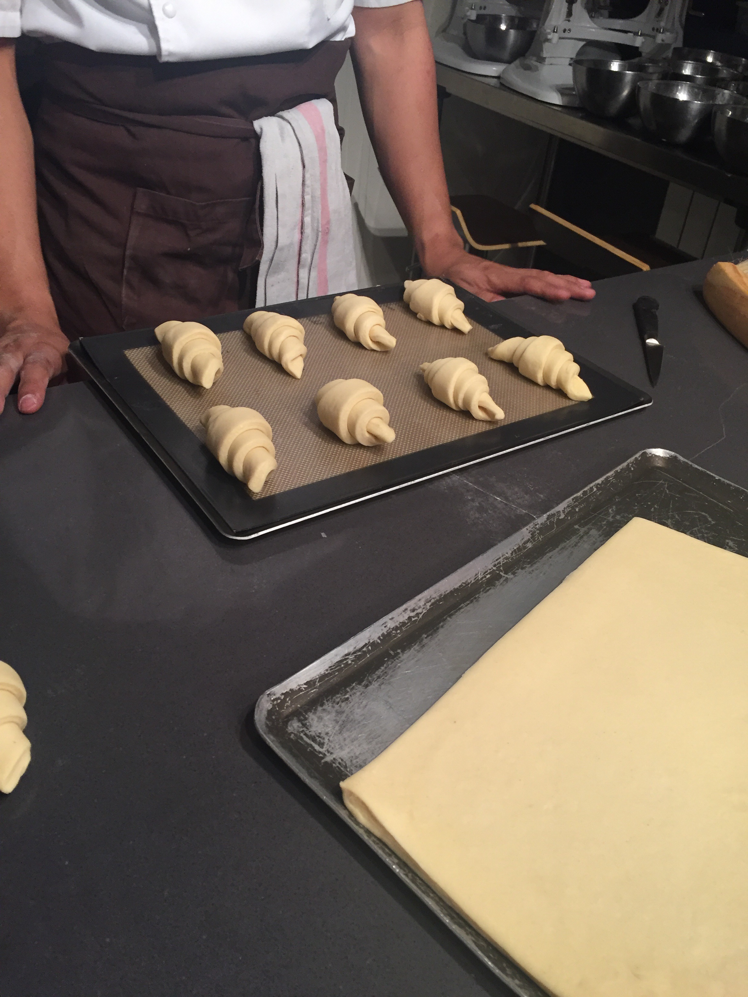 I honestly walked in weary because even though I know Eric is a great teacher, I also know I’m not great in the kitchen (seriously folks, I melted a plate in half “cooking” a pop tart…). We get there and are greeted kindly by the reception and we meet the rest of our classmates (classes are 8 at max capacity). We go downstairs to this basement kitchen that is fully stocked and yet still felt homey. We get plastic aprons and do intros. Then the lesson begins. We have to work quickly since the plan is to make different kinds of croissants all in a 3 hour period…oh and it’s summertime and we can’t let the butter melt! Like seriously butter is a huge deal for croissants and keeping it in its non melted form is very important.