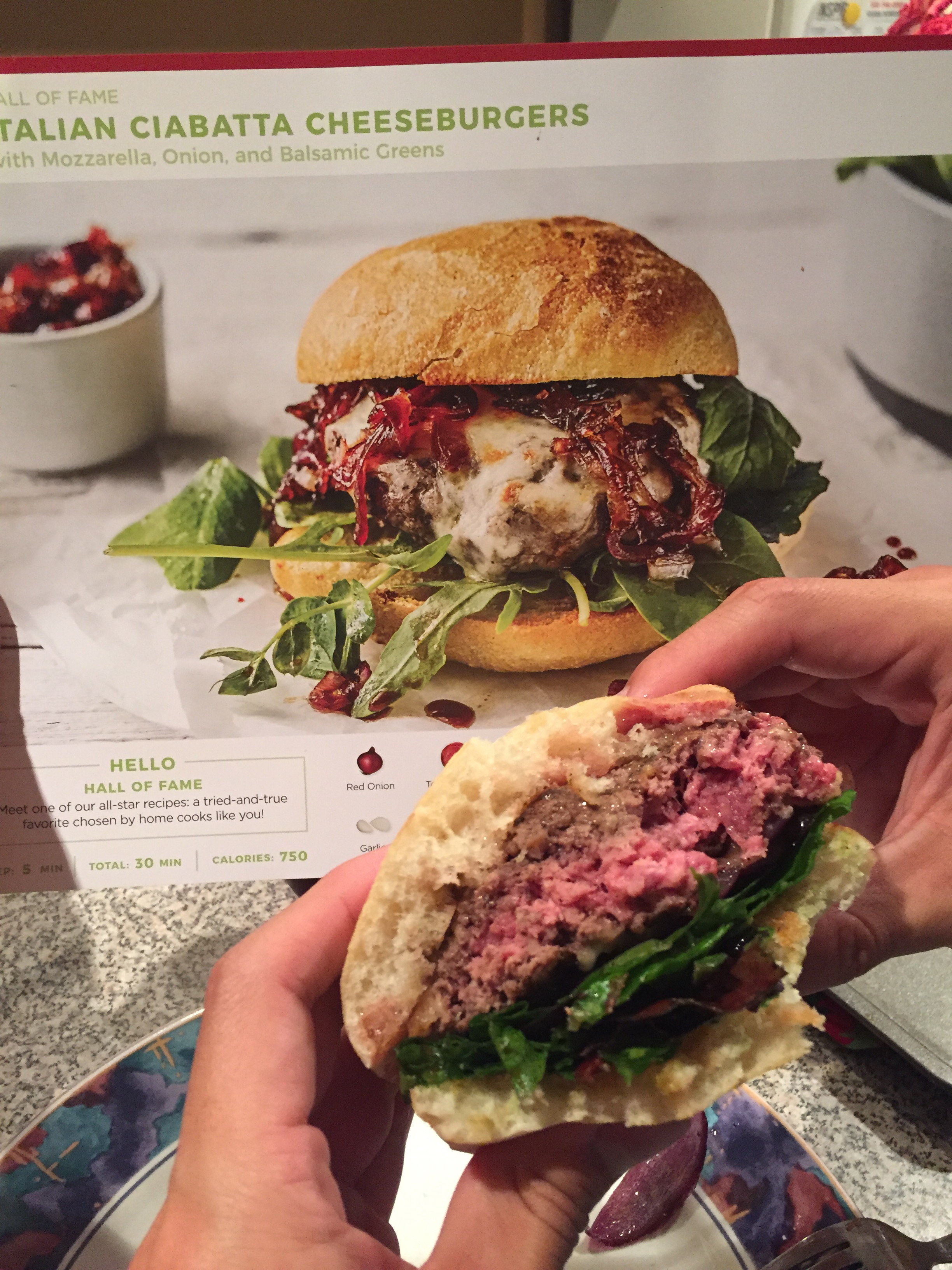 First on the list was the Italian Ciabatta Cheeseburger. I made this with the boyfriend and thank God because the recipe needed a can opener and I don’t own one…boyfriend had to use a knife haha it worked…but dangerous so I just recommend that folks get the basic kitchen utensils 🙂 Anyways, I did a lot of the produce cleaning and chopping and the boyfriend cooked the meat (so far every time I’ve cooked red meat, the fire alarms have gone off teeheehee). The burger was DELISH! I forgot to take a picture before I devoured it…but here’s boyfriend’s half eaten one 🙂