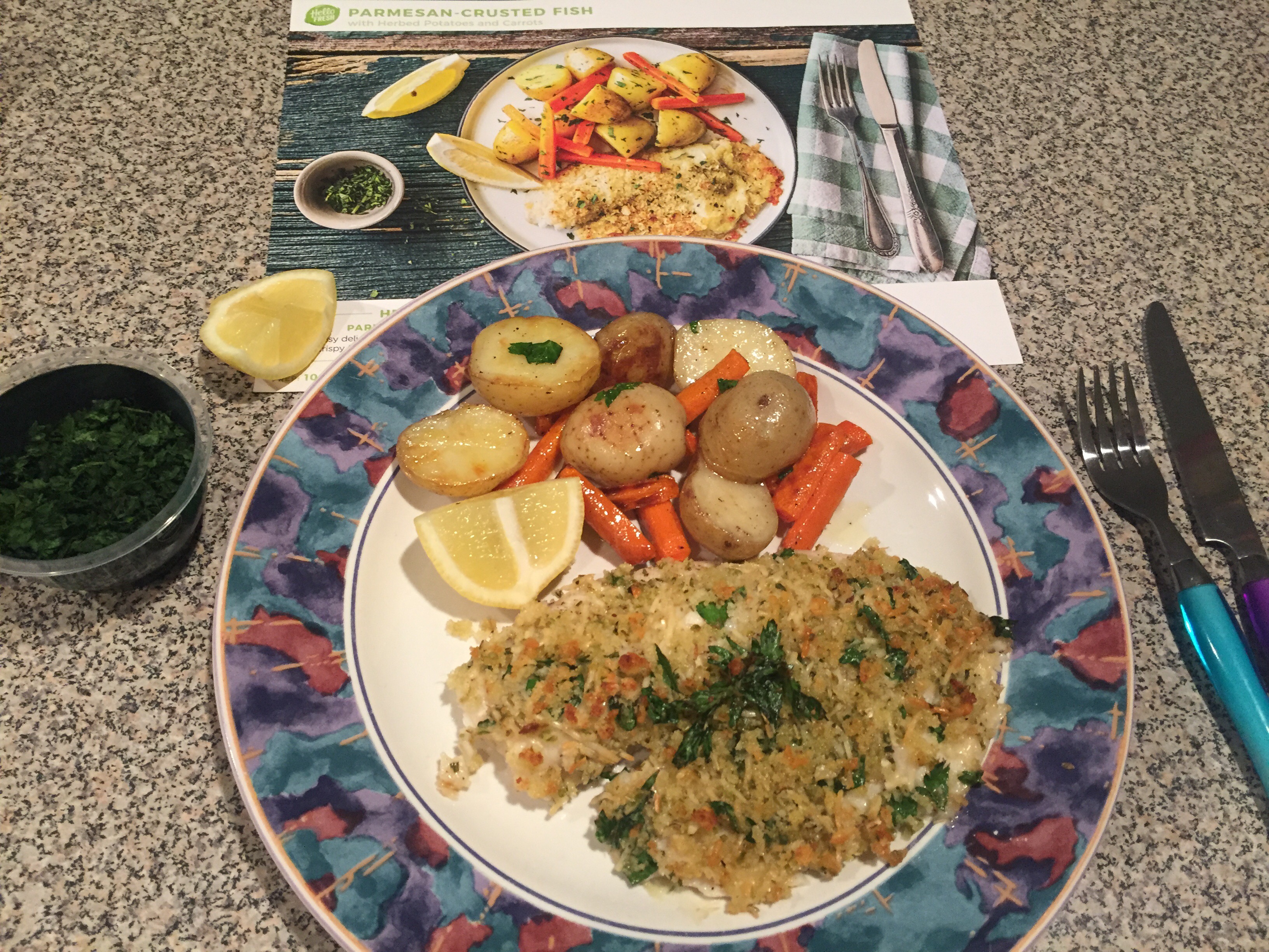 Next up was the Parmesan Crusted Fish. I admit I was a little daunted since fish kind of smells…but this turned out to the easiest of the three meals in my opinion. It was bread crumbs and cheese crumbled together on the fish and a quick bake in the oven. The veggies actually took the most time due to having to peel and chop, but carrots and potatoes are some of the only veggies I like (broccoli is the favorite!) so that was easy. Overall this was my favorite meal!