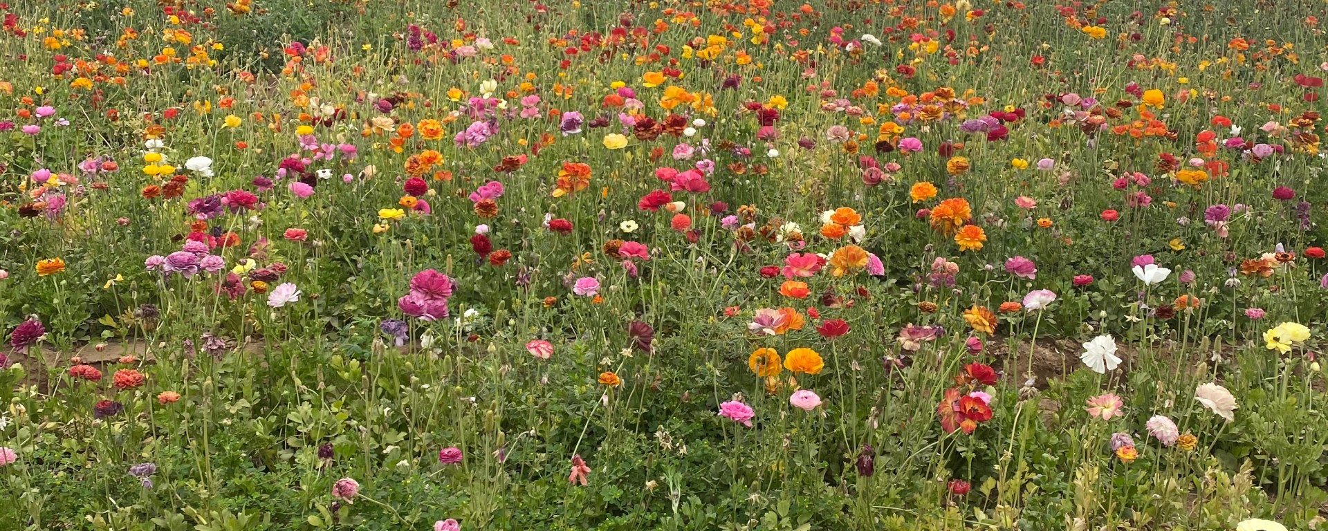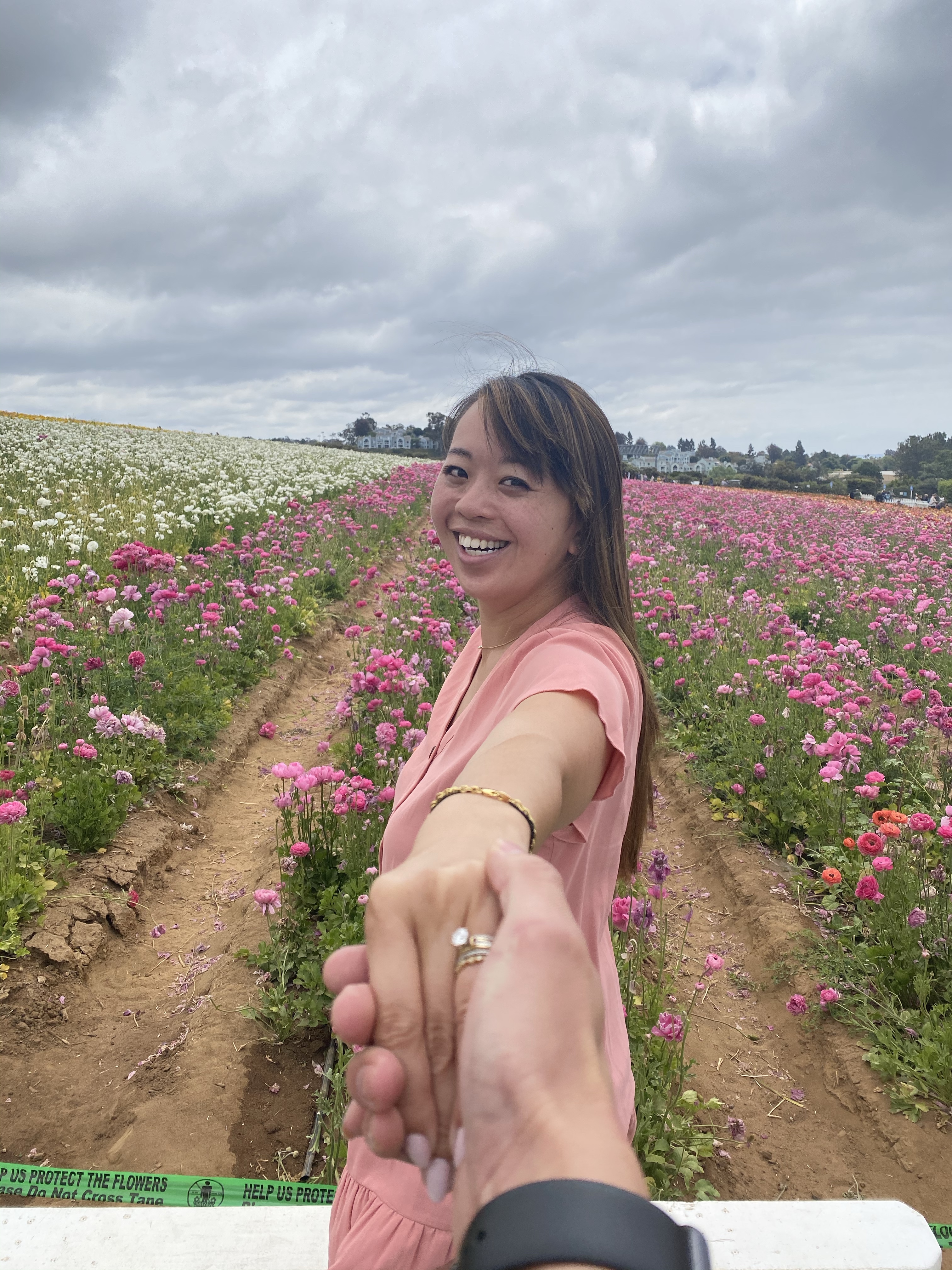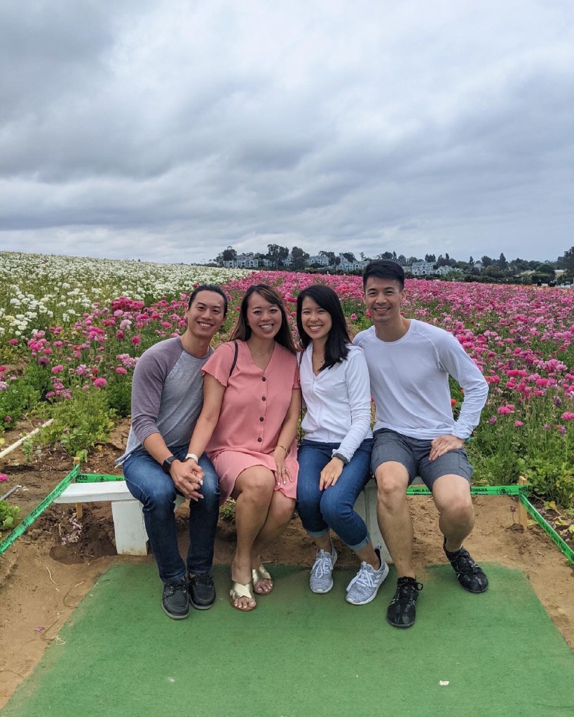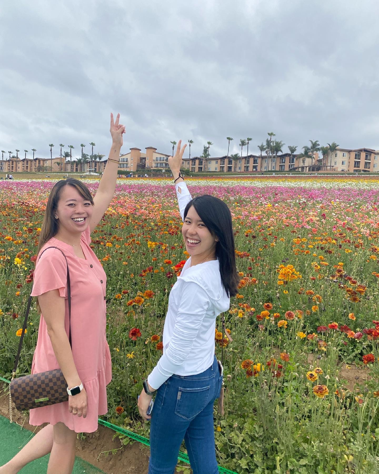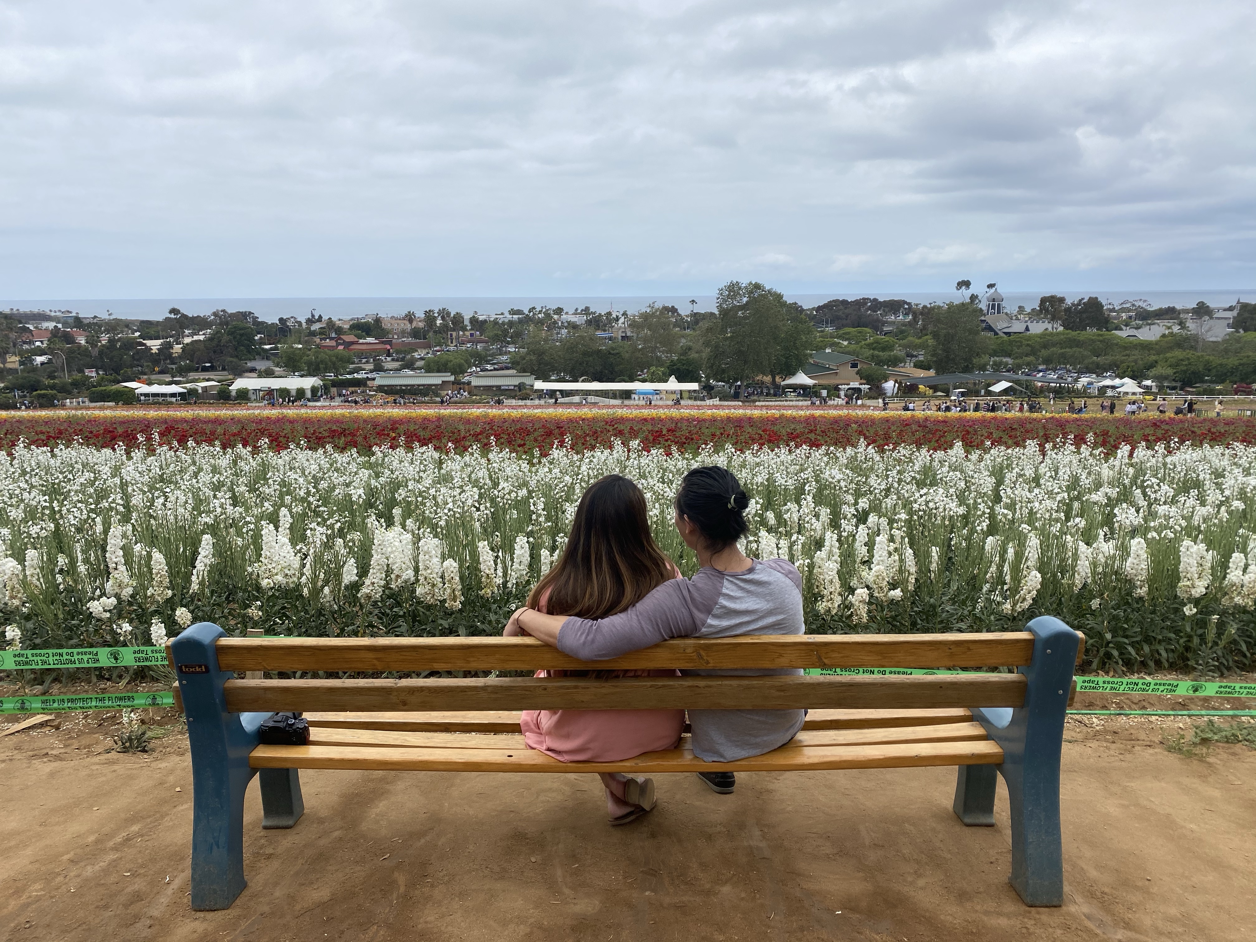 First on the list was to visit the famous flower fields in Carlsbad. You have to buy tickets online (roughly $12/person) ahead of time as they are trying to keep capacity at a minimum. At first we were surprised by how regimented the place felt – it was nothing like the antelope poppies we’d seen before in the wild. However, with all the markers and lines, it allowed for the space to not feel crowded. They also had lines ready to go around the picturesque spots. Please note you cannot stand amongst the flowers as they are marked off and a person on a golf cart will come round and scold you. I didn’t love the green tape that was in a lot of our photos, but you take what you can get. Also the view was gorgeous!