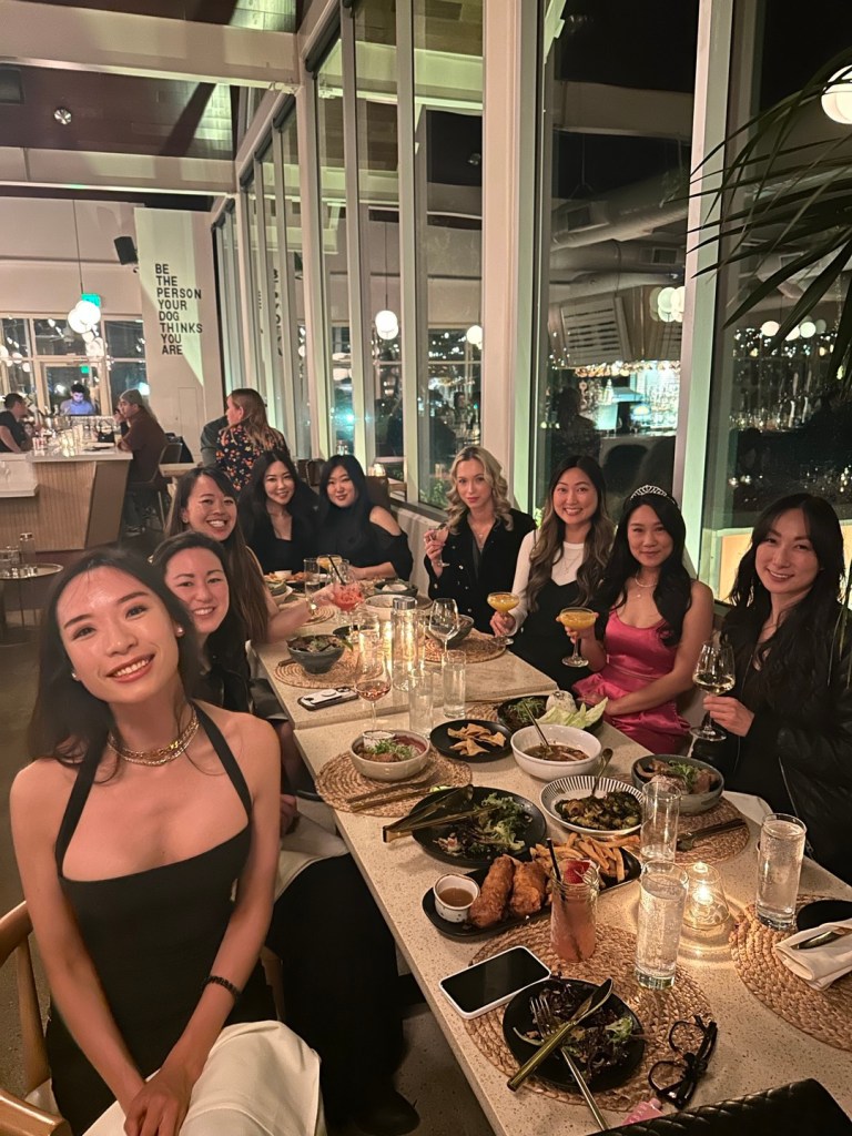 Then we went out to Boozehound for dinner – it seems like a popular spot for bachelorettes as there were 4 other brides there. It’s a prefix menu of either $65/person or $90/person and they only do bookings via email which to be honest isn’t the most efficient because it took forever to get a confirmation from them. The prefix is family style appetizers and dessert and we choose our individual entrees from a set menu. The appetizers were salad, brussel sprouts and shrimp ceviche. This was honestly our favorite part of the meal as the dinner entrees ranged from bland (looking at you chicken adobe) to decent (ramen pork belly), but nothing was a stand out. And lastly dessert was flourless chocolate cake (not a winner), deconstructed cheesecake (my favorite) and passion fruit congee (second favorite).