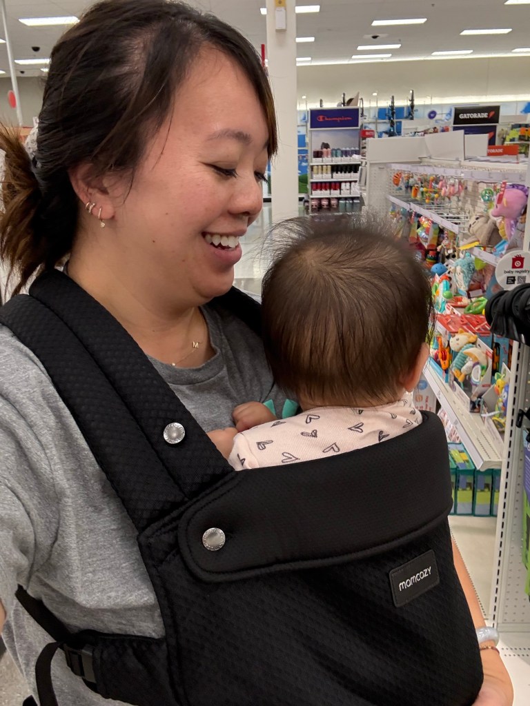 I also tried the MomCozy Purehug Baby Carrier and as silly as this sounds, it felt like a hug with baby girl so I definitely understand where the name comes from 🙂 It has similar attributes to the Embrace carrier that I lived in with my first, but has more support since the material is thicker than the Embrace’s wrap fabric, yet still lightweight mesh fabric. My daughter never liked to be strapped in so we had a lot less carrier time this time around, but it’s nearly impossible to get around without a carrier with two babies so I was desperate. And tada, the PureHug worked for us as baby girl was snuggled close, but the soft mesh fabric was breathable and allowed her (and myself) to not feel confined. The fabric is lightweight and was again very easy for me to bring around on the daily as well as to travel with since it doesn’t add extra weight to my luggage/diaper bag. I do wish there was more lumbar support as my back has never been the same since pregnancy and labor and I have a feeling that once baby girl gets heavier, it could be a bit of a pull on my shoulders over time. However, the padded straps that allow for crisscross strapping don’t add bulk, the supportive thick waist band and simple design (less buckles and pulls) works well for this current season of newborn life. Since she wiggles so much, I have less time to actually tighten and clip in things so having an easy 3 clip process helps a lot – snap in the waistband clip and one on each side, tada, the Purehug allows for baby girl to be in a carrier and for this mama to be hands free so we can have a successful Target visit or grocery trip without any tears from me or her 😉 I also love that the carrier can grow with my baby as it has easy buttons on the interior of the waistband that allows for ease of making the seat portion smaller or bigger as my baby grows to emphasize the importance of the ergonomic “M” position for healthy hip and spine development as well as padded leg openings for good circulation and comfort. This is definitely the ideal carrier for parents who want a lightweight, ergonomic and cozy carrier.